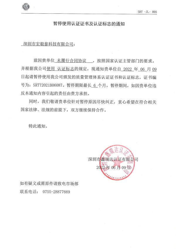 宏毅泰06月09號(hào)暫停通知書(shū)